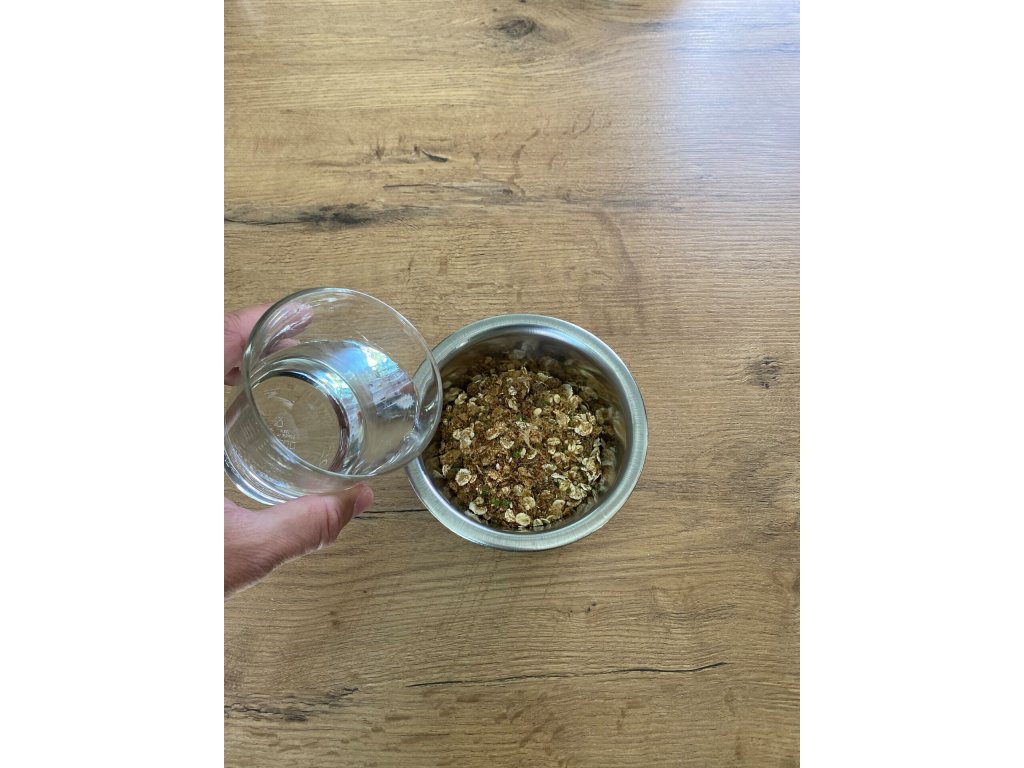 Krmivo zalijte horkou vodou 0,5 až 1 cm nad úroveň směsi a nechte několik minut nasáknout a vychladnout.